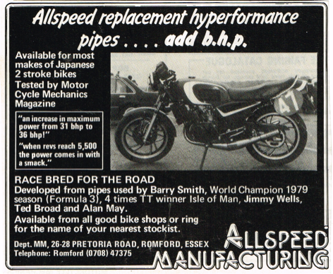 A year later Wheelies & Co sold out to Micron Exhausts. Micron realised that the Allspeed name was still Peter’s so Micron’s exhausts were branded a very similar ‘Genuine Allspeed’. Peter changed his business name to Gibson Exhausts and went onto build race exhausts for many top racers and teams during the late 1980’s and 1990’s.